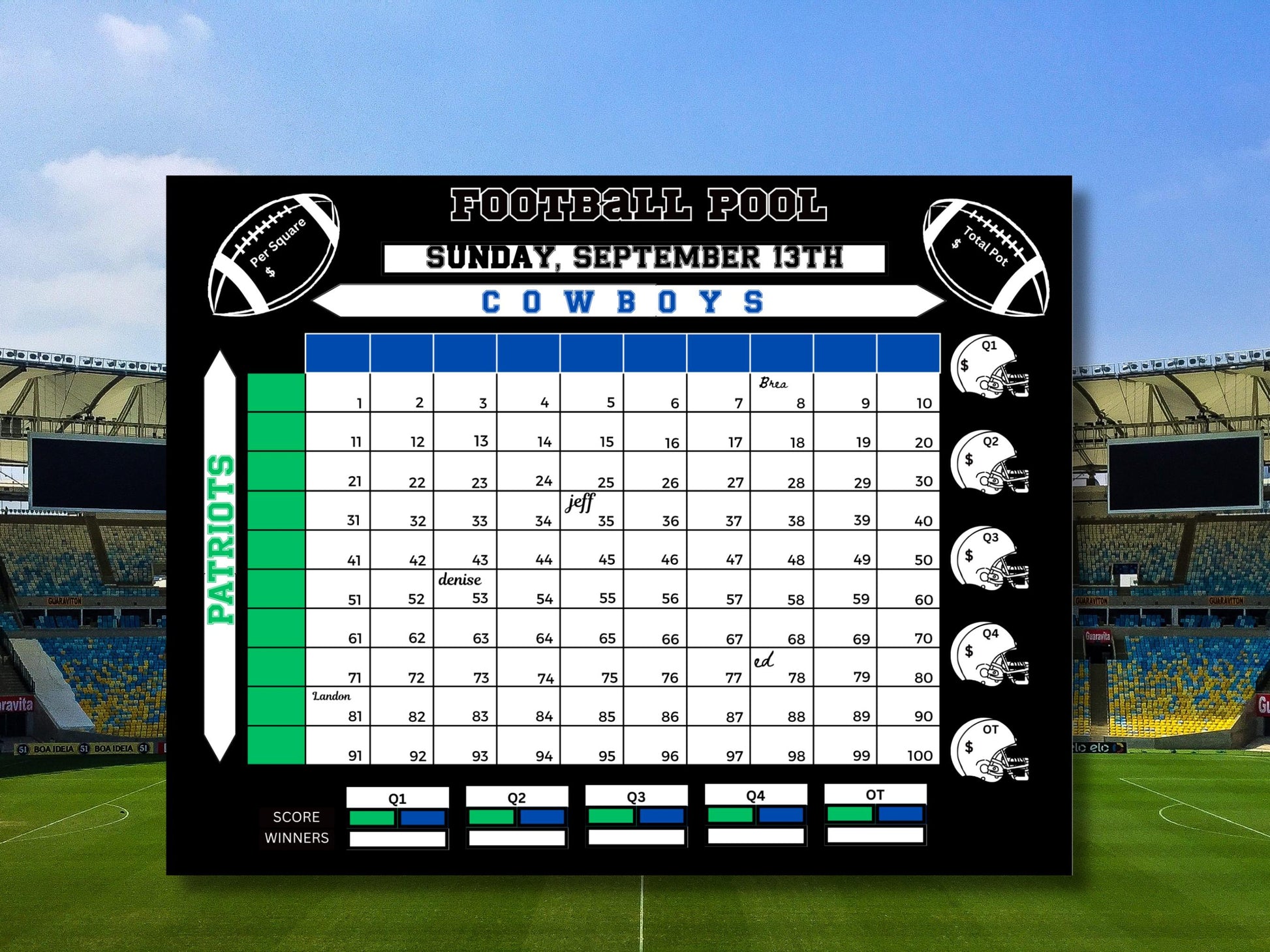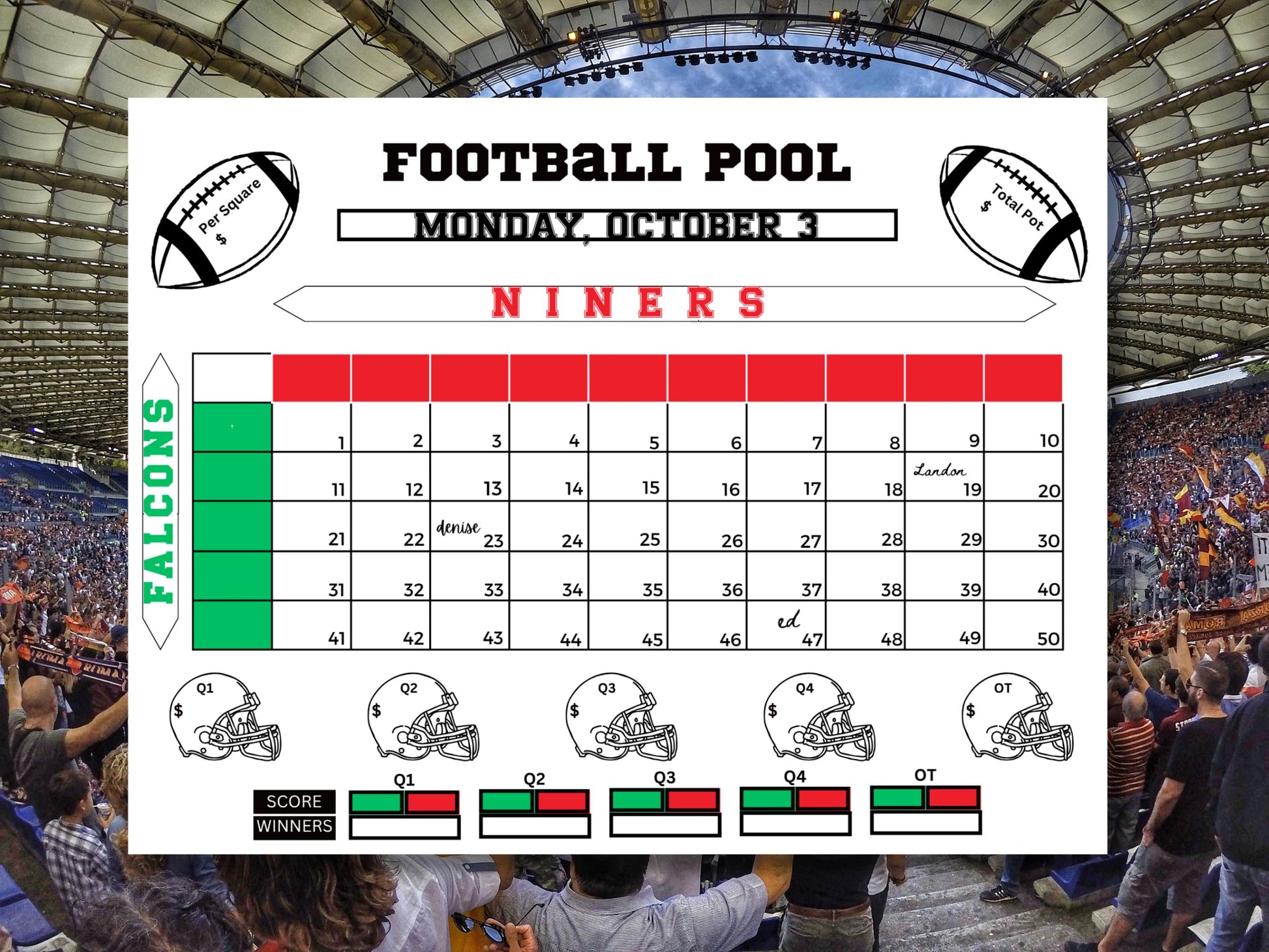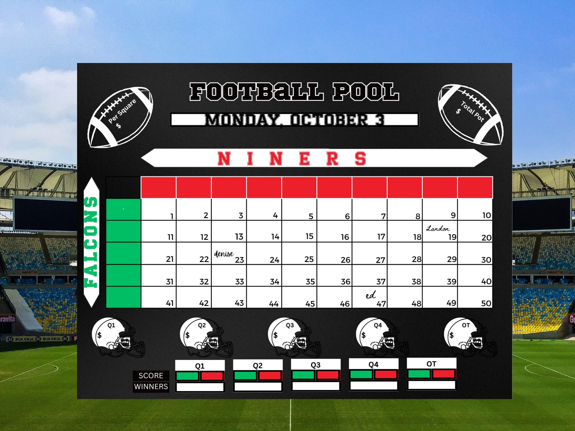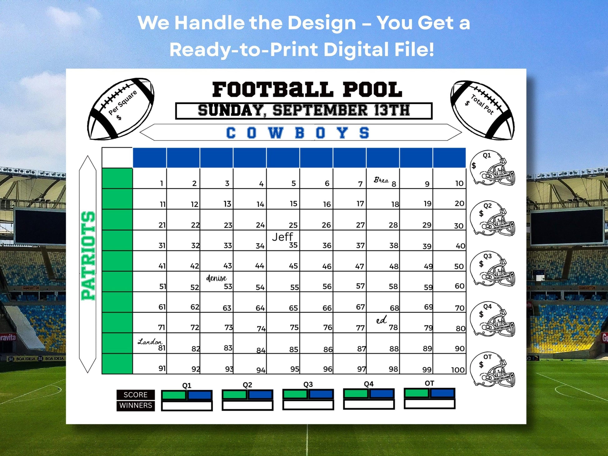 We will customize this easy-to-use pool card in the size of your choice for you. It‘s perfect for both casual and hardcore football fans. Choose to have 11 x 8.5 inch pdf (landscape) or larger at 16x20, or 24 x 36 to display larger on an easel or other location.