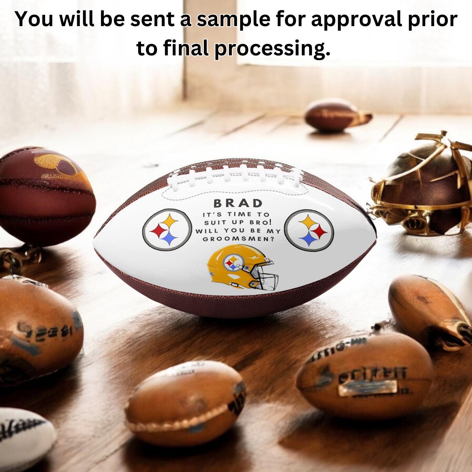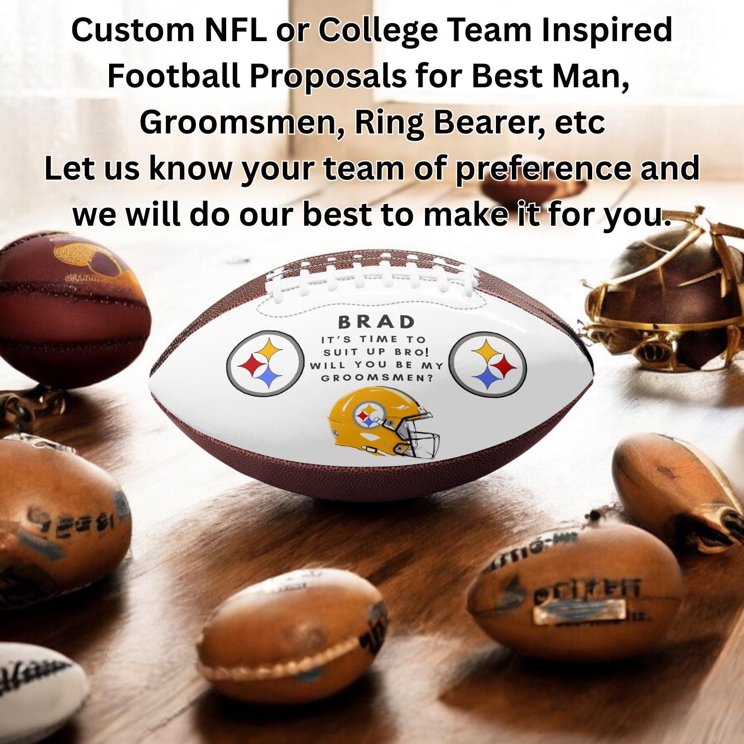 Even more these footballs are inspired by your Groomsmen‘s favorite team NFL or College, we‘ll do our best to make it for you. Just let us know the team, as well as the name and title for the person.