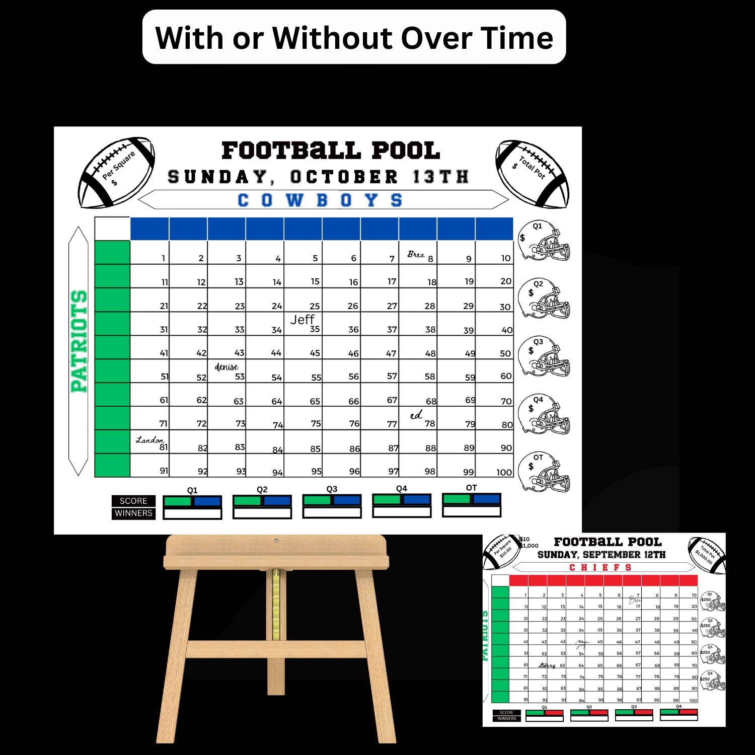 Elevate your game day experience with our Custom Football Pool Square Signs, available in regular or dry erase styles! Perfect for parties, tailgates, or family gatherings, these signs are designed to keep everyone engaged and make your event one to remember. Choose from 50 or 100 squares, with or without overtime, and four distinct styles to fit your unique vibe.