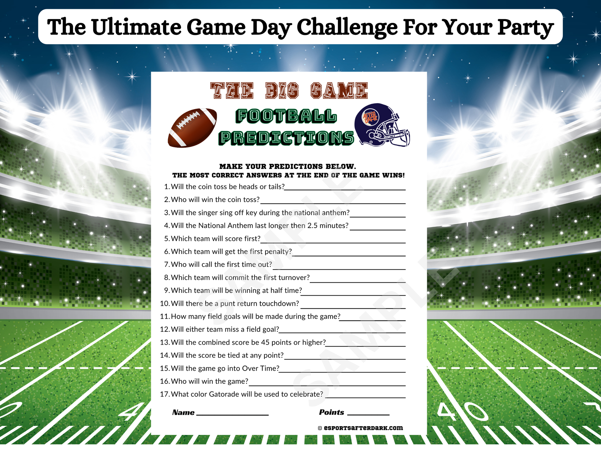 Professionally Printed on Matte Card Stock Paper. Get ready to add excitement to your next football party with this FOOTBALL PREDICTIONS GAME!. Perfect for game day gatherings, tail gates, Super Bowl celebrations, or any football party event. This game will keep your guests entertained while testing their football knowledge and instincts.